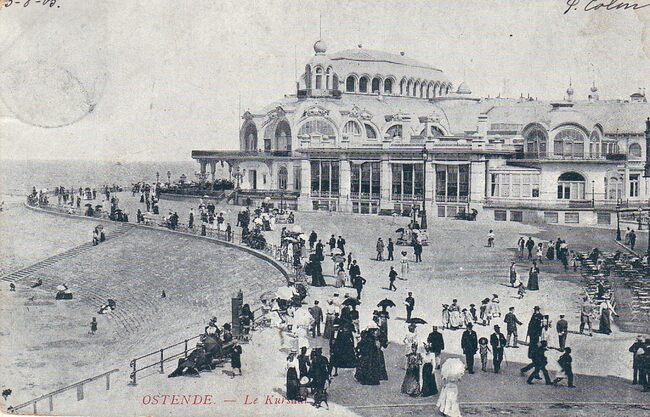 Ostende - La Plage, et le Kursaal (tekst in het rood). - De westgevel van het tweede Kursaal langs de Zeedijk. Het is hoog water op het Groot Strand. Pootjebaden langs de vloedlijn en de burgerij, modieus gekleed, ook op…