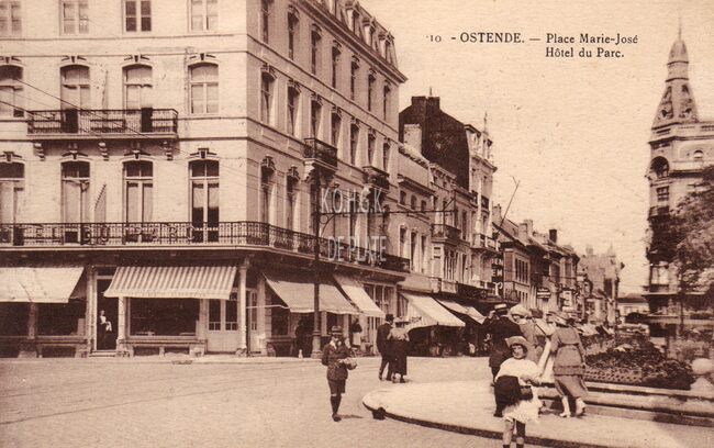 Postkaart Henri Georges, N° 10. - Ostende - Place Marie-José. Hôtel du Parc. - Het Marie-Joséplein, met op de hoek met de Leopoldlaan, het "Hôtel du Parc". Rechtdoor, de Adolf Buylstraat.