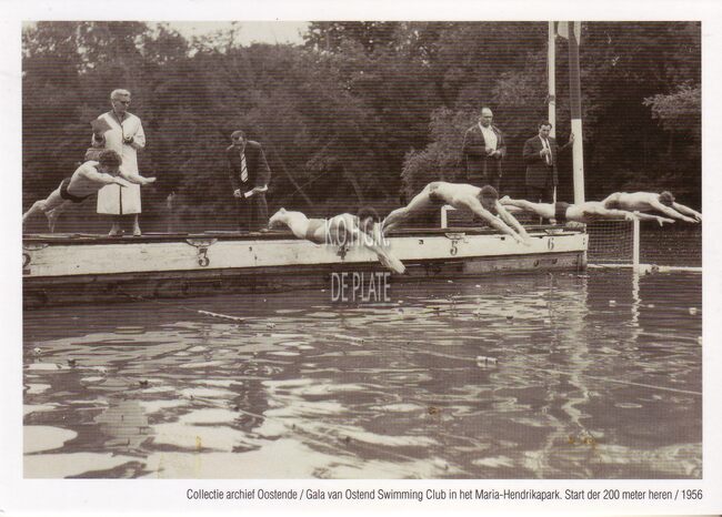 Postkaart (herdruk). - Collectie archief Oostende (Gala van Ostend Swimming Club in het Maria-Hendrikapark). - Start der 200 meter heren 1956