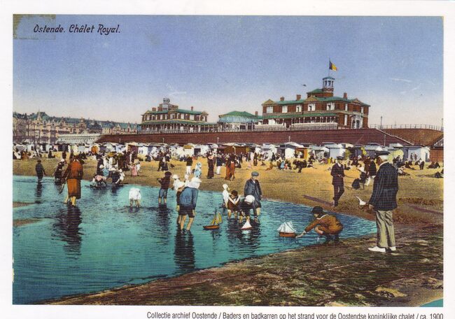 Postkaart, herdruk. - Collectie archief Oostende / Baders en badkarren op het strand voor de Oostendse koninklijke chalet. - Strandrecreatie op het Groot Strand. Op de achtergrond, het Koninklijk Chalet, langs de Zeedijk…