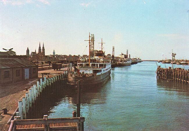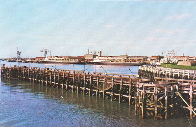 JC. - Pakketboten van de Oostende Dover lijn gemeerd nabij de werkhuizen van het Zeewezen op de oosteroever.