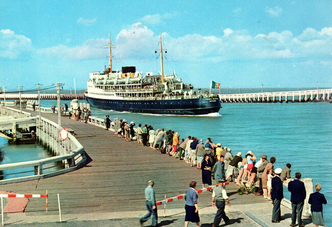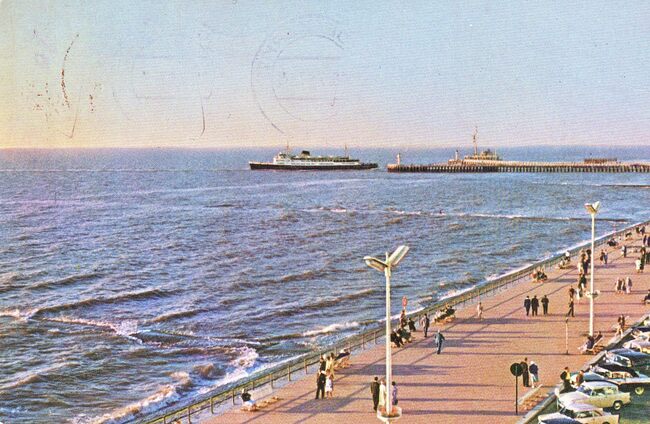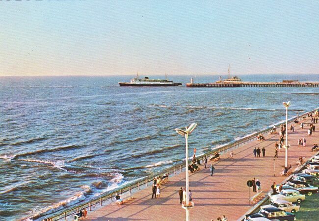 JC. - De Albert I-promenade en links, het Groot Strand bij vloed. Een pakketboot van de Oostende Dover lijn nadert de havengeul