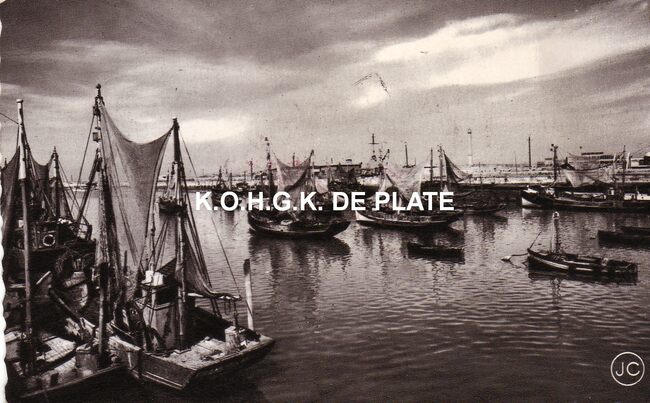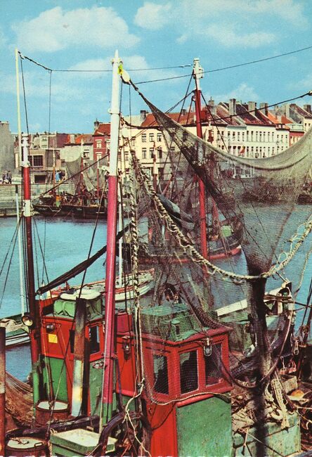 Vissersvaartuigen gemeerd in het Montgomerydok. Wat verder, de Garnaalmijn. Links, de Visserskaai