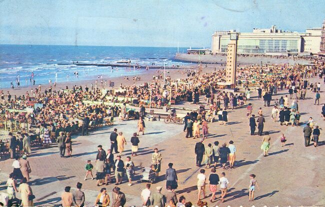 Postkaart JC. - Strandrecreatie op het Groot Strand. De Albert I-promenade met eronder de badinstallaties en het openbaar uurwerk. Op de achtergrond, de westgevel van het vierde Kursaal.