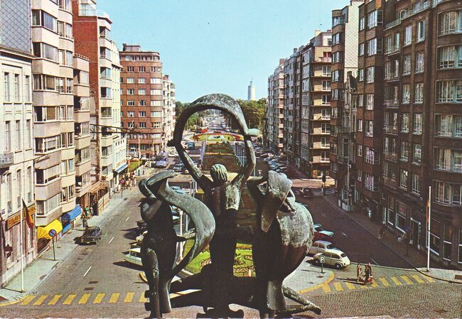 Postkaart JC. - Avenue Léopold II. - De Leopold II-laan richting Leopoldpark. Vooraan op de luifel van de zuidgevel van het Kursaal, de sculptuur van Oscar Jespers "De Vier Elementen". De symbolen voor water,…