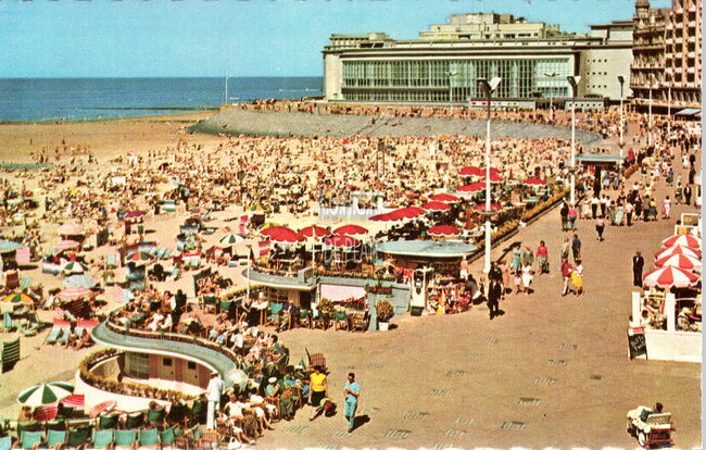 De Albert I-promenade nabij de badinstallaties. Strandrecreatie op het Groot Strand en achteraan, de westgevel van het vierde Kursaal.