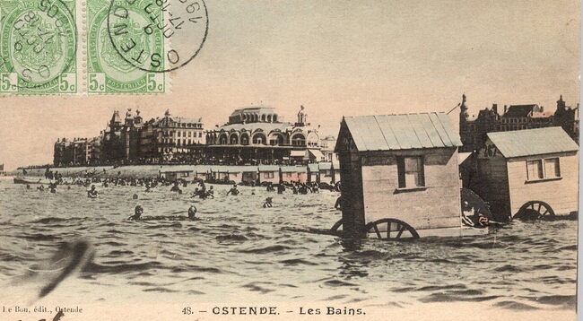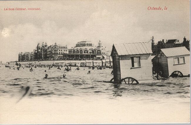 Le Bon, éditeur, Ostende. - In de achtergrond de Zeedijk met het Derde Kursaal, vooraan badkarren in zee met toeristen die aan het zwemmen zijn