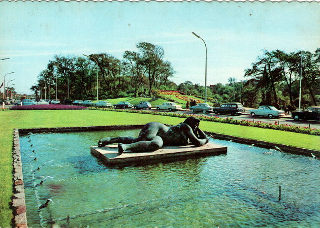 Ed. L'Heembeekoise-Bruxelles, N° 41. - Oostende Leopold Park. Bloemen Uurwerk. Ostende - Parc Léopold. L'Horloge fleurie. - De sculptuur "De Zee", genoemd "Dikke Mathille" van beeldhouwer George Grard, langs de Leopold II…