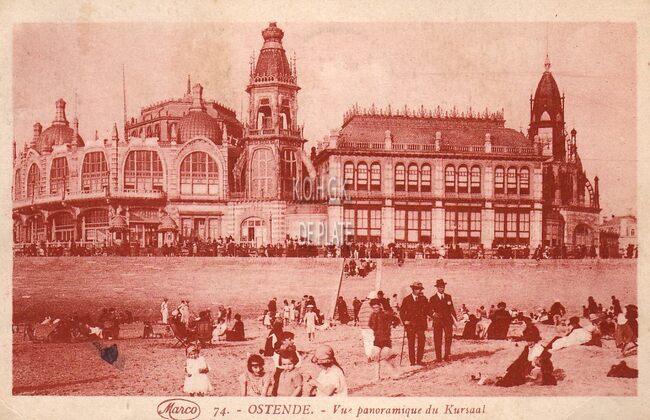 Marco. N°74. - Ostende - Vue panoramique du Kursaal. - Strandrecreatie op het Groot Strand nabij de westelijke gevel van het derde Kursaal langs de Zeedijk