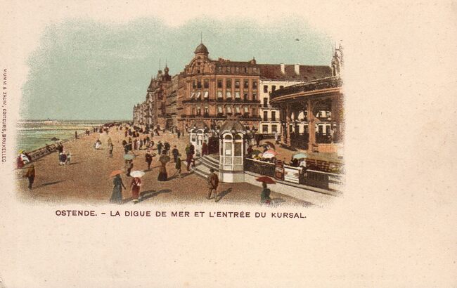Mumm & Zaum, éditeurs, Bruxelles. - Ostende - La digue de mer et l'entrée du kursal. - Bijgekleurde kaart. - De Zeedijk, ten oosten van het derde Kursaal. Op de hoek met de Kursaal-Oosthelling, het "Hôtel…