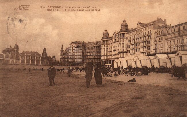 Nelson, Comptoir Artistique, 108, rue Victor Rautier, Bruxelles, N° 9/71. - Ostende - La Plage et les Hôtels. Ostend - The sea coast and Hôtels. - Strandrecreatie op het Groot Strand en rechts, enkele badkarren. De…