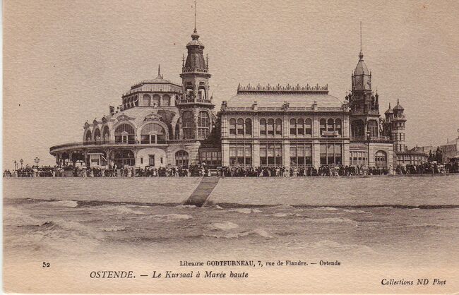 Neurdein,ND Phot 52, Librairie Godtfurneau, 7, rue de Flandre, Ostende. - Ostende - Le Kursaal à marée haute. Het Groot Strand bij vloed en de westelijke gevel van het derde Kursaal langs de Zeedijk