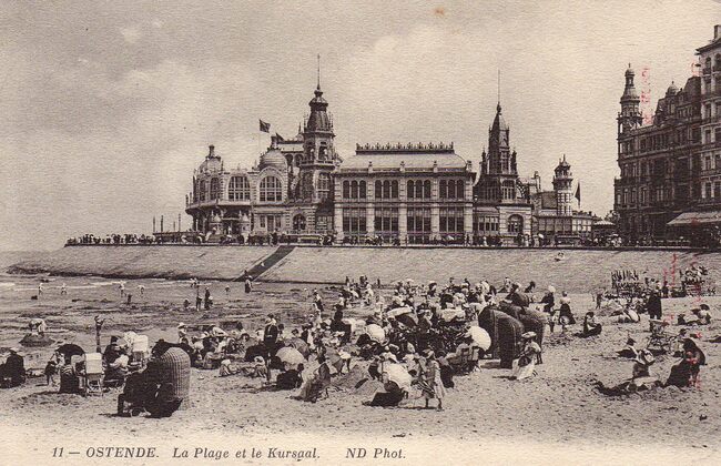 Neurdein/ND Phot 11. - Ostende - La Plage et le Kursaal. Strandrecreatie op het Groot Strand in een periode dat men rieten strandzetels kon huren die bescherming boden tegen wind en zon. Het water is afgaand en kinderen …