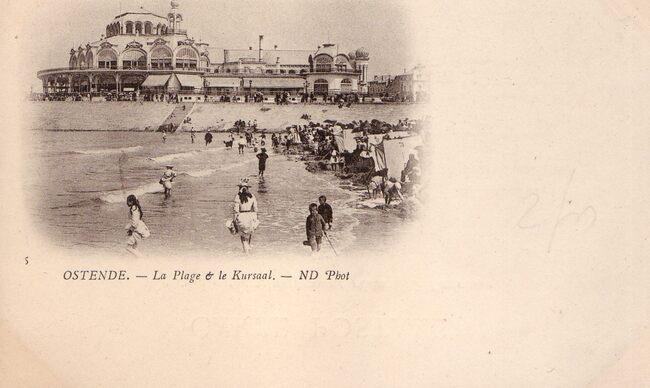Neurdein/ND Phot. 5 - Ostende - La Plage et le Kursaal. De westelijke gevel van de tweede Kursaal langs de Zeedijk. Strandrecreatie op het Groot Strand