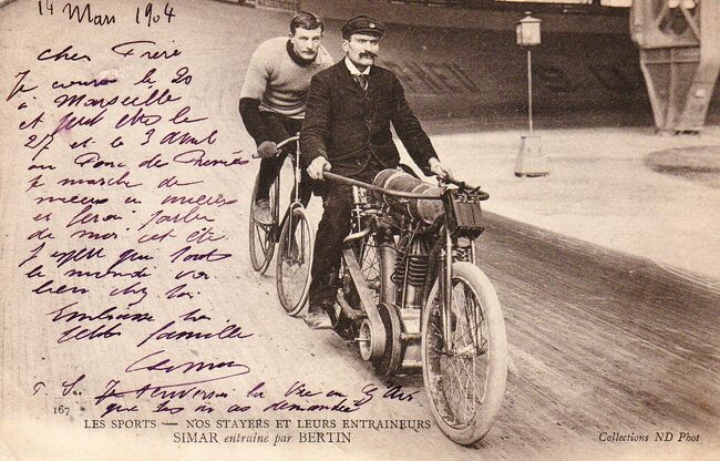 Neurdein/ND Phot..167. - Les Sports - Nos stayers et leurs entraineurs. Simar entrainé par Bertin. - Frans baanwielrenner van 1900 tot 1913. Zijn grootste succes was vice-wereldkampioen te Londen in 1904. Zijn broer Jean…