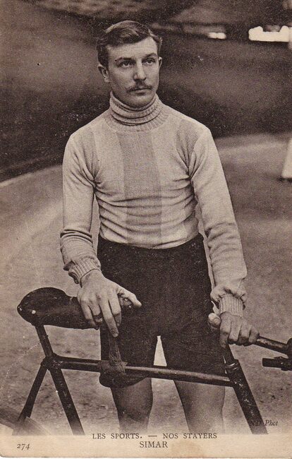 Neurdein/ND Phot. 274. - Les sports - Nos Stayers - Simar. - César Simar, geboren te Rijsel op 29 mei 1897, overleden te Meudon 23 oktober 1934. Frans baanwielrenner, met als specialiteit demi-fond. Stayeren achter een…