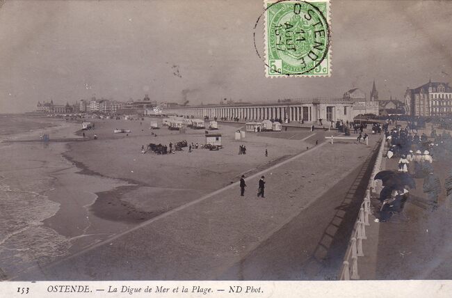[Neurdein], ND Phot. N° 153. - Ostende - La Digue de Mer et la Plage. - De Zeedijk en rechts de Koninklijke Gaanderijen. Het groot strand en de traditionele badkarren. Rechts, het "Sanatorium Maritime Saint-Vincent …