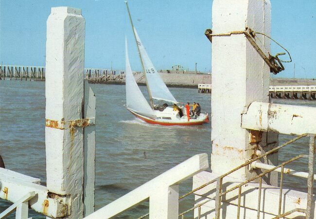 Pluscolor, N° OS 19. - De havengeul gezien vanaf het Weststaketsel. Een zeiljacht op weg naar zee. Aan de overkant, het Oosterstaketsel.