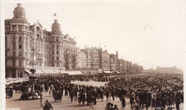 G. Pottier, Ostende, N° 377. - De Zeedijk, ten westen van het Kursaal. Vooraan, "Hôtel Continental", op de hoek met de Ijzerstraat. Op het einde, het "Royal Palace Hotel". Rechts, het Groot Strand…