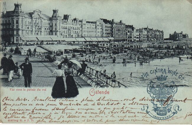 R. & J.D., 4146 bng. [Römmler & Jonas, Dresde]. - Ostende - Vue verls le palais du roi. - Met publiciteit voor "The CIntra Wine C°. - De Zeedijk, gezien vanaf het derde Kursaal, richting het Koninklijk Chalet…