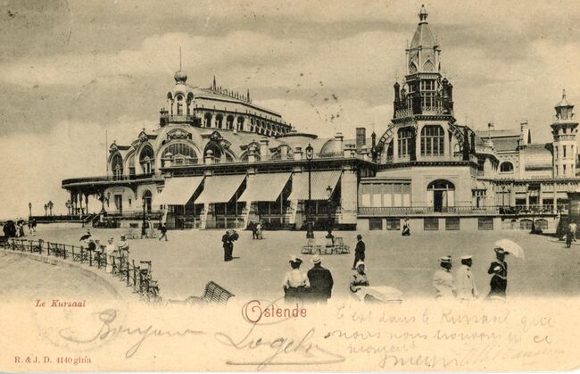 R. & J.D., N° 4154 A,45. - Ostende - Le Kursaal. - Bijgekleurde kaart. - De zuidgevel van het derde Kursaal. Vooraan, de Van Iseghemlaan en links de Kursaal-Westhelling. In de Belle-Epoque was paard en koets een…