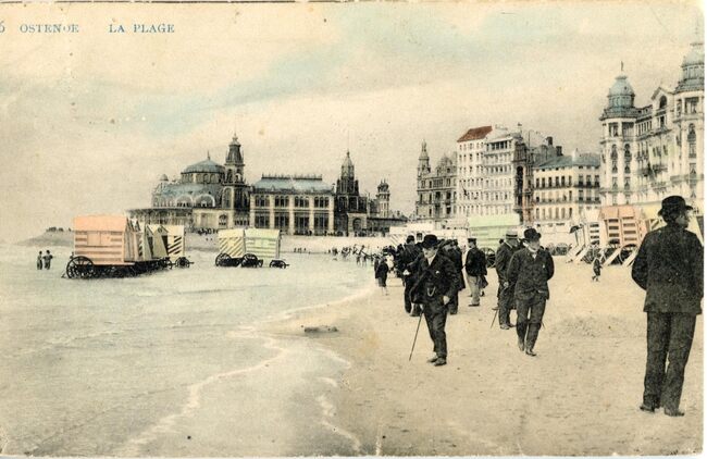 Theys. - Ostende - La Plage. - Bijgekleurde kaart. - Strandrecreatie op het Groot Strand. Rechts, de grote hotels langs de Zeedijk. Op de achtergrond, de westelijke gevel van het derde kursaal tijdens de verbouwing.