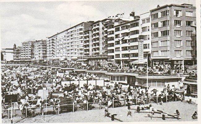 Nels, Ern. Thill, Bruxelles, N° 61. - Oostende - Strand. Ostende - La Plage. - De badinstallaties onder de Albert I-promenade. Strandrecratie op het Groot Strand. We zien de Albert I-promenade vanaf de Kemmelbergstraat (…