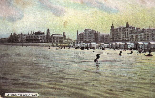 V.0.-D.W. - Ostende - Vue sur la Plage. - Gekleurde kaart. - Zicht vanuit zee. - Rechts, het Groot Strand, de badkarren en de grote hotels langs de Zeedijk.
