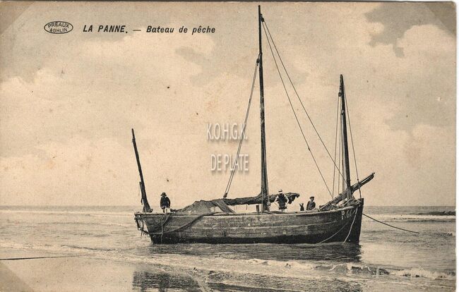 V.P.F., N° 52. Phototypie Préaux Frères, Ghlin. - Ostende - Quai des Pêcheurs. - Oostendse schovers gemeerd in het Schuildok. Op de achtergrond, de Oosteroever met het militaire bouwwerk "De Halve Maan"
