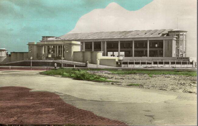 De noordgevel van het vierde Kursaal langs de Albert I-promenade gezien vanop een golfbreker op het Groot Strand.