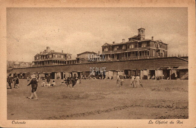Het Koninklijk Châlet gezien van op het Groot Strand. Strandcabines tegen de dijk