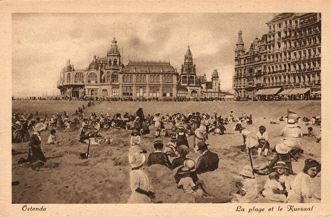 Ostende - La plage et le Kursaal. - Strandrecreatie op het Groot Strand in het interbellum. Rechts, de grote hotels langs de Zeedijk en de westelijke gevel van de derde Kursaal.