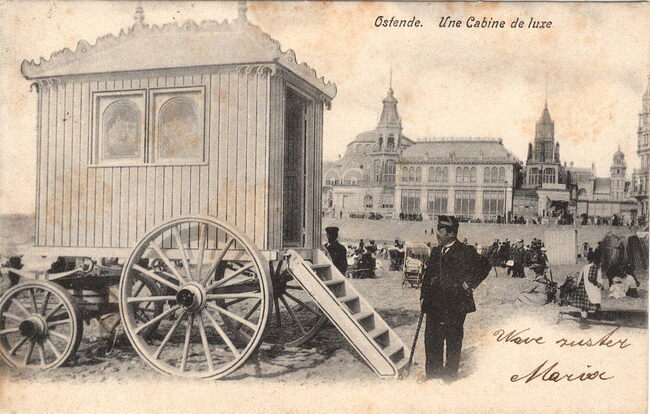 Ostende - Une Cabine de luxe. - Een luxe badkar op het Groot Strand. Op de achtergrond, de westgevel van de kursaal