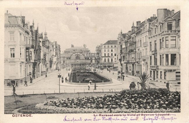 16. - Ostende - Square Léopold et Kursaal. Leopoldsquare en de Kursaal. Leopoldsquare and the Kursaal. - Gekleurde kaart. De Leopoldlaan richting de zuidgevel van de derde kursaal.