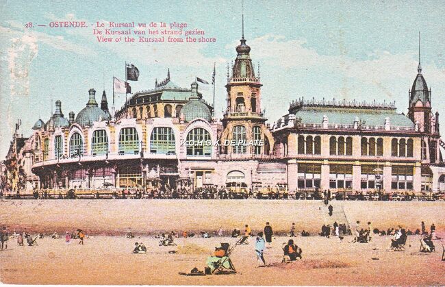 N° 28. - Ostende - Le Kursaal vu de la plage. De Kursaal van het strand gezien. View of the Kursaal from the Shore. - Gekleurde kaart. - Strandrecreatie op het Groot Strand met zicht op de west- en noordgevel van het…