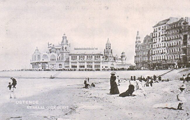 Kursaal coté ouest. - Strandrecreatie op het Groot Strand nabij de westelijke gevel van het derde Kursaal langs de Zeedijk