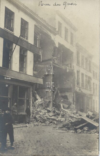 De huizenrij rechtover bakker Pierloot. Tijdens de beschietingen van 21 maart 1918 werden de huizen 34 tot en met 42, 53, 55 vernield of zwaar beschadigd. - MAP 029A/41b