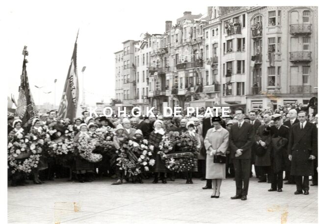 FOTO LUCBOUDEWIJN (1930-1993) (KONING DER BELGEN)FABIOLA (KONINGIN DER BELGEN) (1928-2014)VAN OUTRYVE D'YDEWALLE PIERRE (1912-1997) (GOUVERNEUR)POULLET EDMOND (BURGGRAAF) (VICE-ADMIRAAL ZEEMACHT)SURMONT MICHEL (1891-1975) (STADSSECRETARIS)PIERS JAN (1920-1998) (BURGEMEESTER)NATIONAAL MONUMENT VOOR DE ZEELIEDENZEEHELDENPLEINPLECHTIGHEDEN