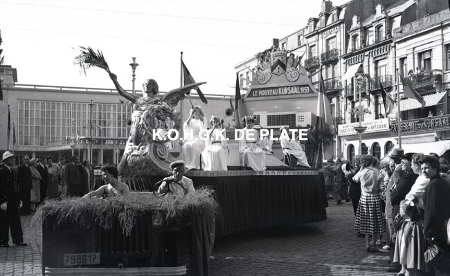 Negatief : 6 x 9 cm. - Stoet naar een ontwerp van kunstschilder Emile Bulcke. Een praalwagen in de Leopoldlaan. Op de achtergrond, de zuidgevel van de vierde Kursaal langs de Van Iseghemlaan.