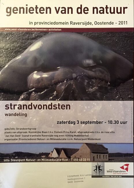 Affiche : Genieten van de natuur: Strandvondsten wandeling: Zaterdag 3 september -10u30: Koninklijke baan t.h.v Domein Prins Karel: Afspraakplaats t.h.v de roze villa "Jan Van Gent"