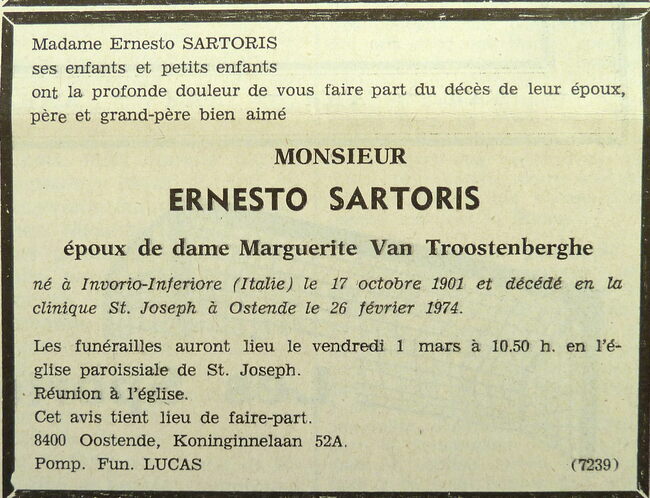 Advertentie : Doodsbericht Ernesto Sartoris