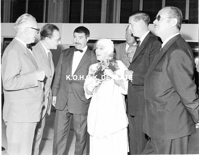 Formaat : 13 x 18 cm. - Koningin Elisabeth tussen Jan Piers, burgemeester en Roger De Kinder, schepen in gesprek met kunstschilder Albert Saverys, naar aanleiding van zijn tentoonstelling in het Kursaal