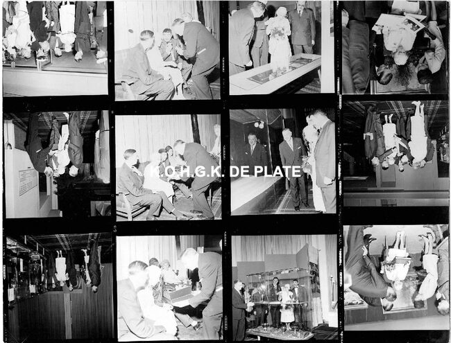 Formaat : 12 x 16 cm. - 12 foto's 4 x 4 cm. - Koningin Elisabeth bezoekt de tentoonstellingen Albert Saverys en Belgische Kunstambachten