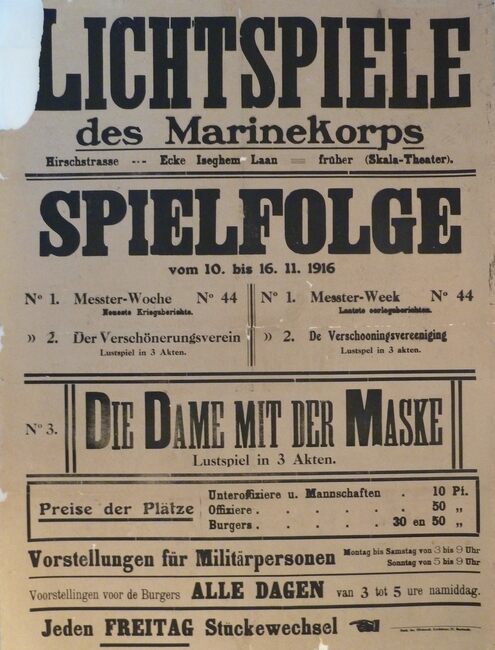 Formaat : 85 x 61 cm. Affiche van cinemaprogramma 10 – 16 november 1916. Linkerbovenhoek beschadigd.