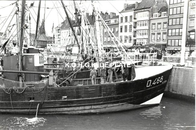 Formaat : 18 x 13 cm. - Vissersvaartuigen gemeerd in het Montgomerydok nabij het Noordzeeaquarium. O.a. de O.468 "Aran" en de O.473 "Kimberly"
