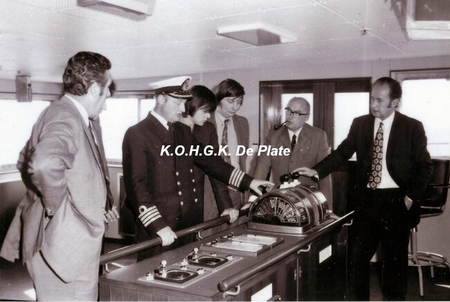 Afdruk, formaat : 29.5 x 21 cm. De brug. Uitleg wordt gegeven door commandant Roland Bedert aan enkele genodigden. Uiterst rechts, R. Pitteljon, commercieel afgevaardigde in London.