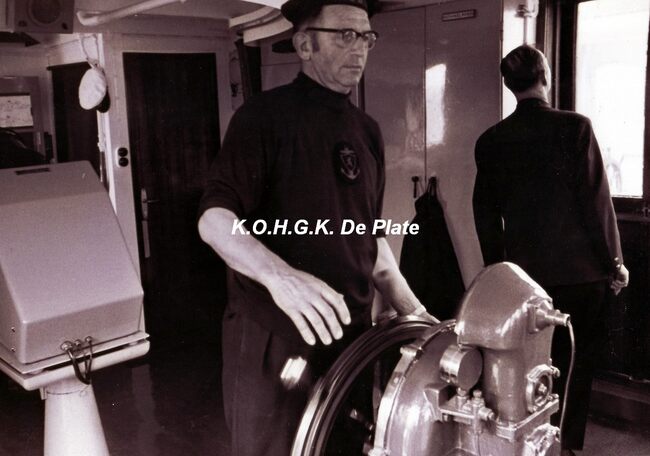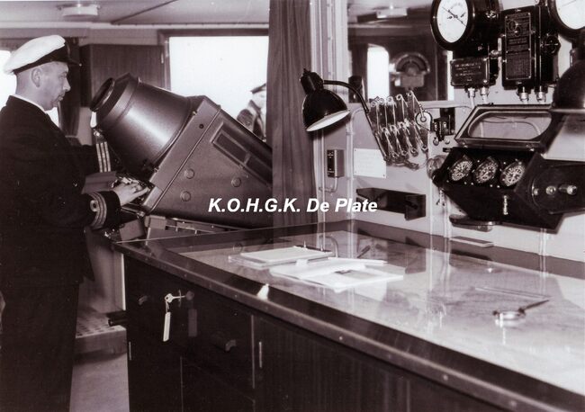 Afdruk, formaat : 29.5 x 21 cm. - De brug, met uiterst links commandant Spoelders. Links vooraan de telegraaf en in het midden het magnetisch standaardkompas.
