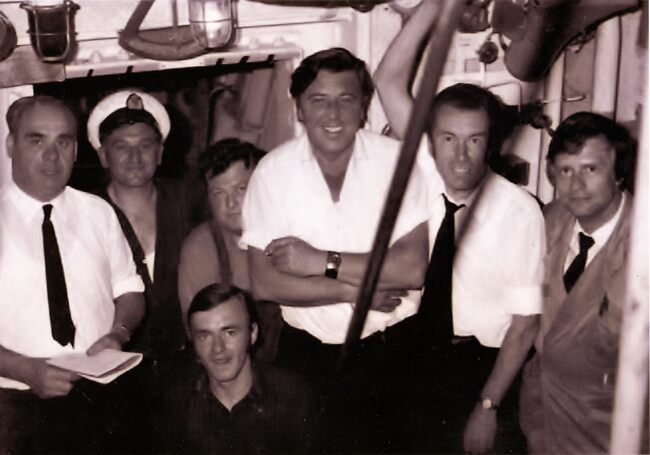 Afdruk, formaat : 29.5 x 21 cm. - Ontvangst van de heer Devany, reporter van de Britse T.V. in het salon van de officieren van de carferry "Prins Albert". Van links naar rechts, Goes Roger purser, Keters A. …