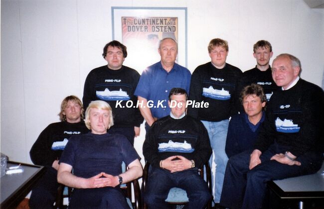Afdruk, formaat : 29.5 x 21 cm. - Commandant G. Holthof gaat met pensioen in 1995. Staande, van links naar rechts : Goethaels A. (purser), De La Rue P. (2de luitenant), Declerck N. (chief-steward). Zittend : Heyndrickx…