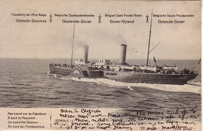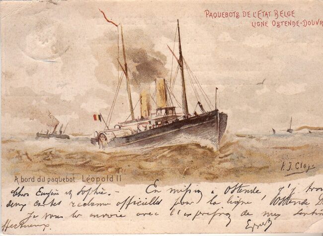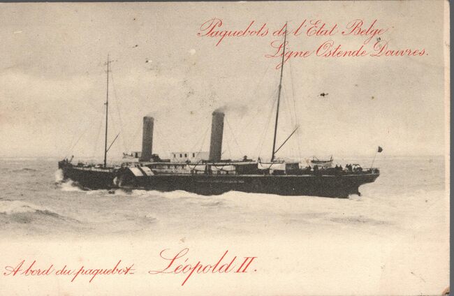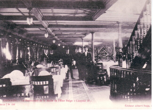 Tekst rechtsboven : Paquebots de l'état Belge Linge Ostende-Douvres. -Linksonder : A bord du paquebot "Léopold II".